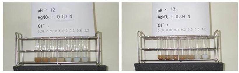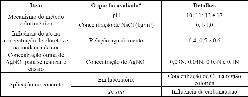 Recentemente, Kim et al. (2013) reavaliaram as variáveis que podem influenciar a técnica. O estudo consistiu em verificar se há mudança na coloração ao se alterar o pH do meio, a concentração de AgNO3 e o teor de cloretos. Além disso, avaliaram se a relação água/cimento influenciaria na concentração de cloretos na fronteira de mudança de cor (border-change color) e se o método colorimétrico é aplicável in situ, ou seja, em estruturas reais. Os itens avaliados e seus detalhes estão apresentados na Tabela 1.