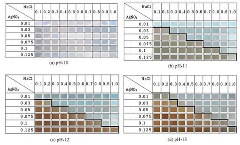 Para avaliar a influência do pH na coloração, Kim et al. (2013) ensaiaram, como apresenta a Figura 7, diversas concentrações de nitrato de prata e cloretos para diferentes valores de pH.