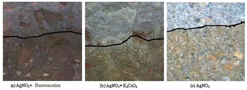 Comparação entre os três métodos: O método colorimétrico que utiliza apenas nitrato de prata é o mais simples entre os três; o uso de cromato de potássio e de fluoresceína exige maior tempo de reação para obter melhor efeito da coloração. O uso de AgNO3 resulta em uma mudança clara na maioria dos casos, portanto, é o método mais utilizado. Na Figura 9 é possível observar que o limite de mudança de cor entre a zona que contém cloreto e a zona livre de cloretos é visível nos três casos. Entre os três, o uso de AgNO3 + fluoresceína e o método AgNO3 são muito similares. No entanto, o método AgNO3 + fluoresceína não apresenta uma fronteira muito clara.