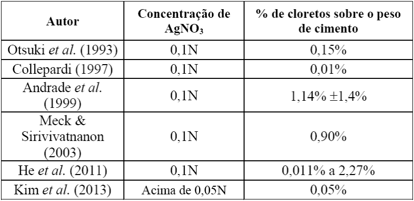 Ainda segundo Otsuki et al. (1993), para concentração de AgNO3 igual a 0,1N, o teor mínimo de cloretos livres que gera essa alteração de cor é igual a 0,15% em relação à massa de cimento. Entretanto, Collepardi (1997) defende que esse teor mínimo é igual a 0,01% (Jucá, 2004; França, 2011; Mota, 2011). Já Andrade et al. (1999) encontraram, com 95% de confiabilidade, que o ponto de viragem é de 1,14%?1,4 em relação à massa de cimento. Esse valor está em concordância ao defendido por Meck & Sirivivatnanon (2003), que é igual a 0,9% de cloretos em relação à massa de cimento. Em 2011, He et al. encontraram que esse teor crítico de cloretos está entre 0,011 e 2,27% sobre o peso de cimento. Deve-se destacar que não existe consenso sobre o teor de cloretos livres quecausa a mudança de cor na solução de AgNO3 0,1N, uma vez que os dados disponíveis nos estudos citados são tão discrepantes.