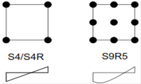 Tipo de elemento: Tres elementos comúnmente usados por el software FEM en el análisis de pandeo elástico de estructuras de paredes finas son los elementos S9R5, S4 y S4R como se muestra en la Fig.1. Los S4 y el S4R son elementos de cascarón de propósito general de cuatro nodos, válidos para problemas de cascarón grueso y fino. Ambos elementos usan funciones de forma lineal para interpolar la deformación entre nodos. El elemento S4R fue usado para mezclar el modelo. Ventaja del elemento S4R sobre el S4 es que el S4R usa integración reducida con control de hourglassing, membrana finita de tensiones.