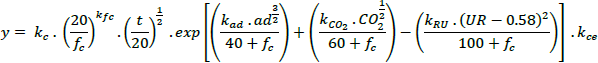 Em que y é a profundidade carbonatada (mm), a é a velocidade de carbonatação, f c refere-se à resistência à compressão do concreto (Mpa), f clim valor limite da resistência à compressão do concreto que pode ser carbonatada (MPa), t é o tempo de exposição (anos) e ac é a relação água/cimento do concreto. As demais variáveis são dependentes do tipo de cimento e ambiente de exposição sendo elas definidas por cada um dos autores por meio de tabelas. Mais detalhes sobre as equações e a sua utilização podem ser obtidos em Félix (2016).