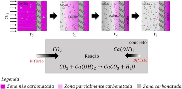 O ingresso do dióxido de carbono (CO2) causa a redução do hidróxido de cálcio (Ca(OH)2) presente na matriz porosa do concreto e, como consequência dessa redução, o pH do concreto diminui de 13 para aproximadamente 8, deixando a armadura suscetível à corrosão (Bakker, 1988; Chang et al., 2006). Segundo Possan et al. (2017), com o crescente desenvolvimento das cidades, a tendência mundial de aumento das emissões de CO2 na atmosfera traz consequências diretas às estruturas de concreto em ambiente urbano. Isso porque a velocidade de carbonatação aumenta com a elevação do CO2 no meio ambiente, afetando o ciclo de vida das estruturas e reduzindo a durabilidade das mesmas.