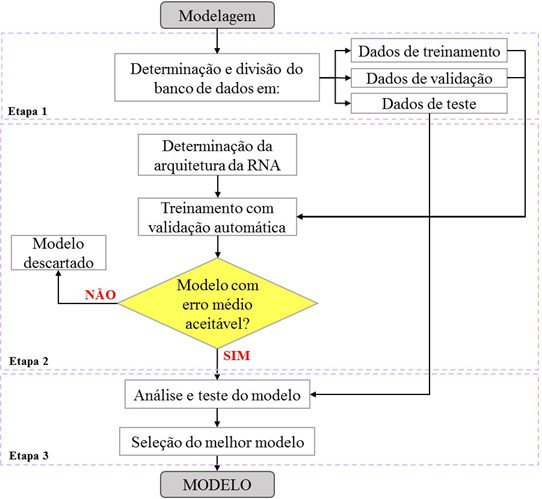Cada um destes subconjuntos (treinamento, validação e teste) foi utilizado em uma etapa do processo de modelagem com as RNAs. O primeiro é responsável por apresentar os pares de entradas e saídas para que a rede possa aprender. O segundo é responsável pela verificação e validação do treinamento da rede. E o terceiro é responsável por testar e verificar o potencial de generalização do modelo.