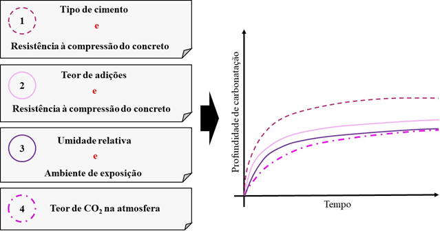 Existem diversos trabalhos na literatura em que a carbonatação e seus fatores de influência são descritos, existindo um vasto referencial teórico acerca do tema (Hamada, 1969; Parrot, 1987; Helene, 1993; Houst et al., 2002; Pauletti et al., 2007; Possan 2010; Talukdar et al., 2012). Pauletti et al. (2007) e Possan (2010) citam que, de maneira geral, os parâmetros que influenciam na carbonatação são relacionados às: (i) condições ambientais: temperatura, umidade relativa do ar e concentração de CO2; (ii) características do concreto: composição do traço, qualidade da sua execução, teor de adições, condições de cura e composição química do aglomerante; e (iii) condições de exposição: ambiente interno, externo e proteção à chuva.