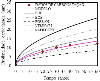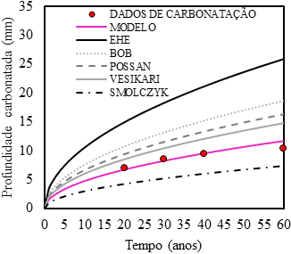 Os resultados encontrados, demonstram a aplicabilidade do modelo, e que o mesmo se apresenta como uma ferramenta eficiente para a estimativa da profundidade de carbonatação do concreto.