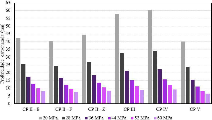 Observa-se na Figura 9 que concretos produzidos com cimentos CP III e CP IV apresentam maior profundidade de carbonatação, principalmente em concretos com baixa resistência à compressão. Em trabalhos encontrados na literatura (Jiang et al., 2000; Possan, 2010) verifica-se a existência de uma influência negativa de adições no avanço da frente de carbonatação, devido à redução da reserva alcalina do concreto quando produzidos com cimentos CP III e CP IV, os quais possuem elevados teores de escória (de 35 a 70%) e pozolana (de 15 a 50%) em suas composições, respectivamente. Destaca-se que os cimentos compostos CP II-E e CP II-Z também possuem adições em sua composição (escória e pozolana, respectivamente), contudo em teores menores que os cimentos CP III e CP IV, o que explica a menor profundidade carbonatada para concreto produzidos com estes cimentos.