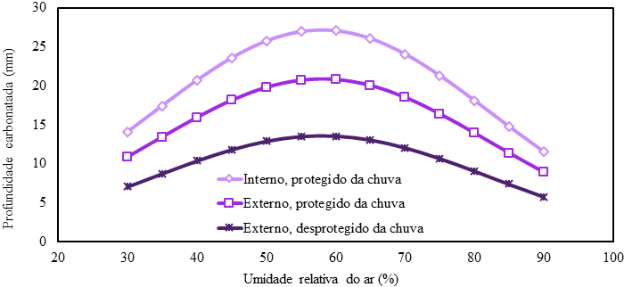 Por meio do modelo desenvolvido, observa-se na Figura 11 que a carbonatação é máxima para umidade próxima dos 60%. Parrot (1987), Neville (1997) e Possan (2010) apontam que a carbonatação alcança seu valor máximo quando a umidade relativa se situa entre 50 e 80% e que a mesma pode ser considerada como o fator ambiental de maior influência na carbonatação. Possan et al. (2017) comprovaram a influência da umidade interna do concreto na profundidade de carbonatação em uma estrutura real. Os autores observaram em uma barragem de concreto com 35 anos de construção, que quanto maior a umidade interna, menor a profundidade de carbonatação observada, sendo que para umidade em torno de 100% a carbonatação medida em campo foi nula. Por fim, na Figura 12 é apresentada a evolução da profundidade de carbonatação em função do ambiente de exposição, sendo este diferenciado pelo grau de exposição ao CO2 para uma estrutura de concreto com resistência à compressão de 30 MPa, cimento CP III, umidade relativa de 65%, sem adições e situado em um ambiente externo desprotegido da chuva.