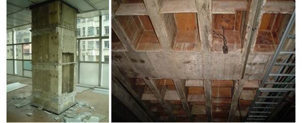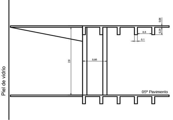 Las losas del edificio eran nervadas y se moldearon en el sitio con un grosor de mesa superior de 6 cm (Figura 7). Las costillas tenían 10 cm de ancho y 28 cm de alto hasta el fondo de la losa o la mesa superior, y estaban separadas cada 50 cm. Desde las columnas/pilares hasta el límite donde se instaló la piel de vidrio, la losa estaba en equilibrio, con una sección triangular masiva que se reducía en función de la distancia a la columna/pilar (Figura 8).