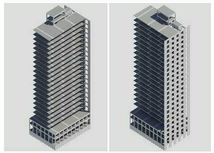 Por lo tanto, el sistema estructural principal de la estructura, responsable de su estabilidad, estaba compuesto por columnas/pilares de concreto con sección "H", formando pórticos en una sola dirección con vigas con bandas, a la misma altura de la losa, agregadas a las paredes de concreto de las cajas de ascensor y escalera. Además, una gran pared reticulada, compuesta por columnas/pilares, vigas y mampostería, formando una pared estructural de divisa con un vecino, como se puede observar en el modelo hipotético presentado en la Figura 9.