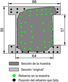 Después del corte de diamante de la sección de la columna recolectada de los escombros, fue evidente la disposición del refuerzo dentro de la columna, y luego fue posible reconstruir la sección transversal del estiramiento de la columna muestreada, como se muestra en la Figura 11.