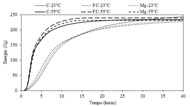 O calor total liberado durante as primeiras 40 horas de hidratação de cada pasta curada a 23°C e 55°C é apresentado na Figura 3. À temperatura de cura de 23°C, durante as primeiras 12 horas de hidratação, os traços feitos com FC e Mg apresentaram calor total liberado maior em comparação com traço de controle feito com 100% de cimento. Em cerca de 14 horas, o calor total liberado a partir de todas os traços eram semelhantes. Após 14 horas, o traço de controle feito com 100% de cimento apresentou calor total liberado maior em comparação com os traços feitos com FC e Mg. Na temperatura de cura de 55°C, o traço com FC apresentou calor total liberado maior em comparação com o traço com Mg e o traço de controle feito com 100% de cimento. O traço com Mg apresentou calor total liberado maior nas primeiras 18 horas de hidratação em comparação com o traço de controle feito com 100% de cimento. Após 18 horas, os traços feitos com Mg e 100% de cimento tinham calor total liberado semelhante. O aumento do calor total liberado da pasta de cimento HE com a adição de partículas finas (FC e Mg) deve-se à aceleração da reação de hidratação na qual está em alinhamento com a literatura (Kumar et al. 2013, Ye et al. 2007, Pera et al., 1999). A precipitação dos produtos de hidratação a partir da solução de poros é assumido como sendo semelhante na superfície de partículas de FC e Mg uma vez que ambos os materiais apresentam características físicas semelhantes.