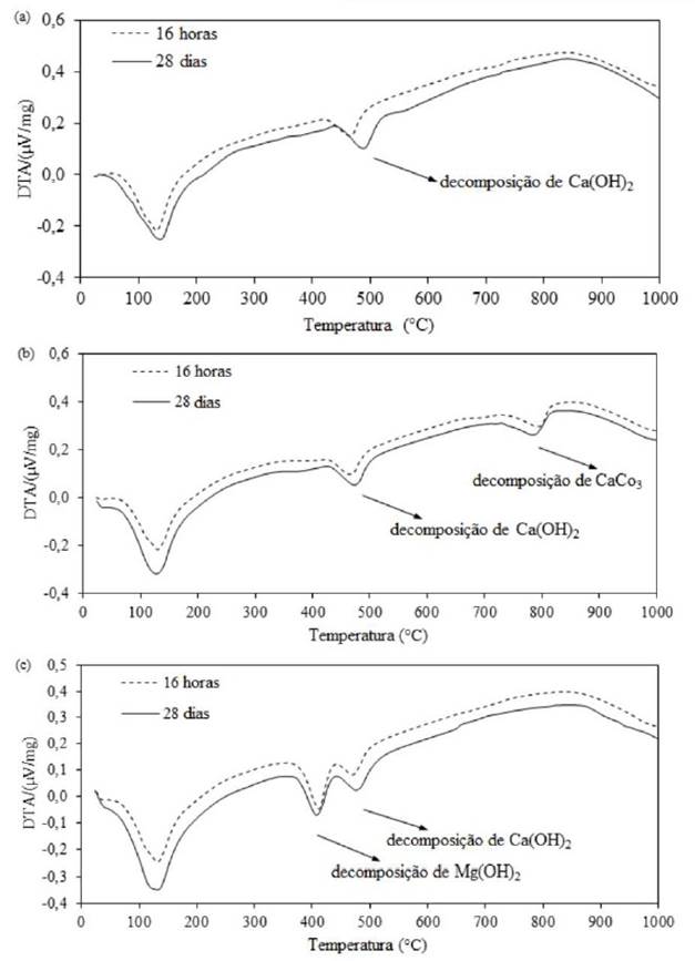 Figura 5 Efeito da composição de traço nos resultados de DTA das pastas de cimento às 16 horas e 28 dias (a) 100% de cimento, (b) FC e (c) Mg
