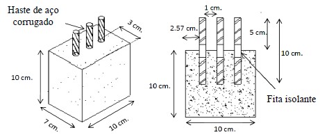 As armaduras foram limpas para evitar grande oxidação, graxa, poeira ou incrustações na superfície. Foram inspecionados visualmente para verificar se não havia fraturas, deformações ou imperfeições que afetassem a resistência ou adesão ao concreto. As hastes de aço de 10 cm foram enfaixadas no meio com fita isolante, de aproximadamente 2 cm, para evitar a entrada da solução por capilaridade. A área do aço em contato com o concreto foi de 13,35 cm² e foram confeccionados dois corpos de prova para cada revestimento utilizado, bem como para a amostra controle.