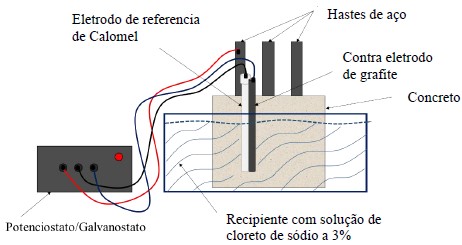 Para as medições de PC, utilizou-se um arranjo de três eletrodos, usando um eletrodo de Calomel saturado (SCE) como referência, um eletrodo de trabalho (tubos de ensaio encapsulados) e uma barra de grafite como contra-eletrodo. Os parâmetros operacionais foram os seguintes: potencial de varredura de -200 mV abaixo do Ecorr e até +1000 mV, e velocidade de varredura de 100 mV / min. Um copo de 250 ml foi usado como um recipiente para os eletrodos e a solução simulada.