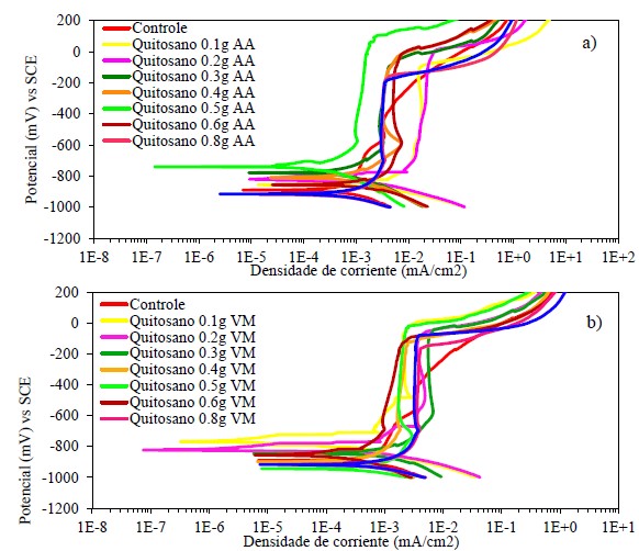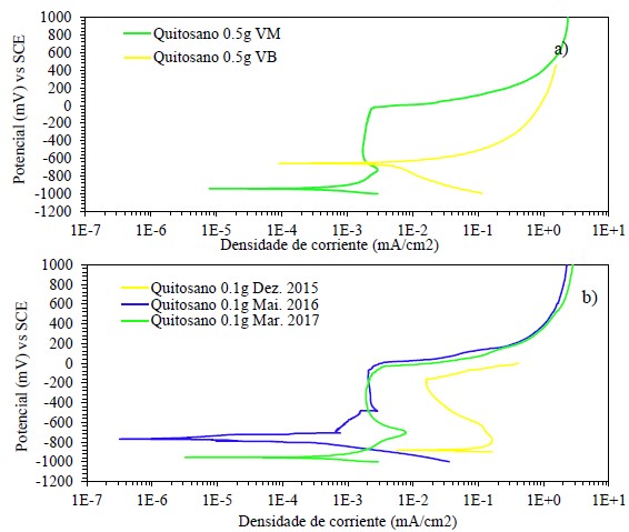 Na Figura 8a, é visto o gráfico de PC para a quantidade de 0,5 g de quitosana dissolvida em vinagre de maçã em relação ao solvente de vinagre branco de álcool de cana-de-açúcar. Pode-se observar que a amostra com revestimento dissolvido em vinagre branco não apresentou zona de passivação, mas sim zona de formação de produtos de corrosão. Isso confirma o uso do vinagre de maçã como o melhor solvente da quitosana, com a conseqüente formação do melhor revestimento.