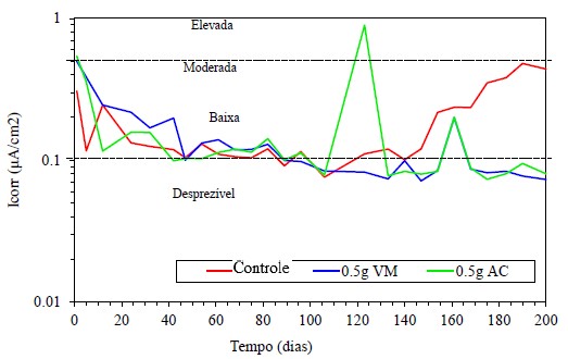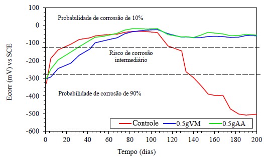 No início do período de ensaio (cura do concreto) a amostra controle atinge rapidamente valores de Ecorr muito nobres, próximos a -100 mV para o dia 28; o aço sob condições de alta alcalinidade, presença de umidade e oxigênio forma uma camada passiva de óxidos que protege o metal na ausência de íons agressivos (Hansson, 1984). Os corpos de prova revestidos atingiram esses valores de Ecorr próximos aos 40 e 50 dias de ensaio, possivelmente devido à presença do revestimento que retardou a formação da camada de óxido passivo.