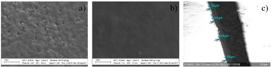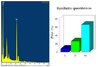 Pode-se observar que no primeiro caso (Figura 13a) o revestimento apresenta porosidades enquanto no segundo caso (Figura 13b) é mais homogêneo. Na micrografia (Figura 13c) e caracterização química elementar (Figura 14) que foi obtida por meio do MEV, observa-se a espessura do revestimento composto por 0,5g VM, com espessura de filme de 2,06μm a 2,89μm, sendo este um filme fino. A análise elementar apresenta apenas carbono do revestimento, oxigênio e ferro do metal base.