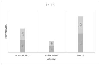 En la figura 2 la prevalencia de las manifestaciones bucales en pacientes con SIDA bajo terapia antirretroviral según género, se presenta con mayor porcentaje en el masculino con 67% y solo con 33% en el femenino.