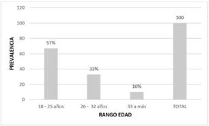 En la figura 3 según la edad, la prevalencia de las manifestaciones bucales Prevalencia de las manifestaciones bucales en pacientes con SIDA bajo terapia antirretroviral se encuentra en un 57% entre los 18 - 25 años, en un 33% entre los 26 y 32 años y sólo un 10% de 33 a más años.