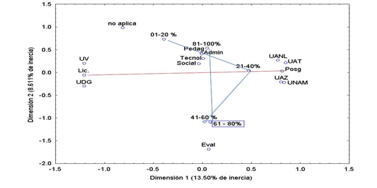 Se aplicó una prueba de Ji2 tablas de dos por dos, definiendo dos niveles de competencia: alto para aquellas ponderaciones de cuatro y cinco, y bajo para las ponderaciones de uno, dos y tres; con esta reagrupación de variables se pudo aplicar el estadístico bivariado para determinar si el nivel académico o la experiencia que los alumnos puedan tener a su vez como facilitadores influyen en las ponderaciones otorgadas a sus docentes. Finalmente, el análisis de correspondencias multivariado ayudó a observar la asociación entre las variables y su intensidad (Greenacre, 2008) con lo que pudo determinarse la influencia que la combinación de las variables institución y grado académico tiene sobre las percepciones de los alumnos.