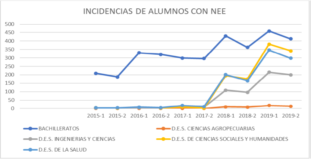 Sobre la información anterior, es preciso resaltar el incremento de alumnos con NEE en el plano educativo universitario y que no se aplican criterios en los registros específicos ante el área de control escolar durante su ingreso, permanencia o egreso, por lo que solo se expresan en términos generales basados en la discapacidad de las personas.