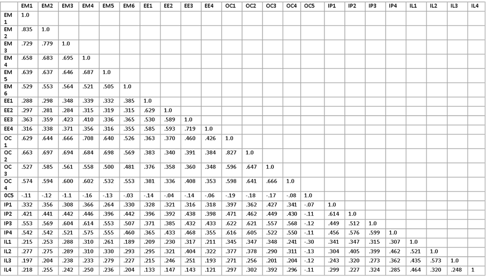 El análisis descriptivo en relación con la media y desviación estándar de todas las variables observables se presenta en la Tabla 2. Allí se puede observar que el valor de la media más bajo corresponde al ítem IL1, “Me concentro más fácilmente en mis cursos en línea”, con un valor de 3.51, y el ítem que presenta el valor promedio más alto es el EM6, con un valor de 6.09: “El profesor tuvo un trato cordial y respetuoso”. Ello indica la empatía de los profesores hacia los estudiantes, quienes muestran que no es fácil concentrarse en esta modalidad de los cursos en línea a la que no estaban acostumbrados.