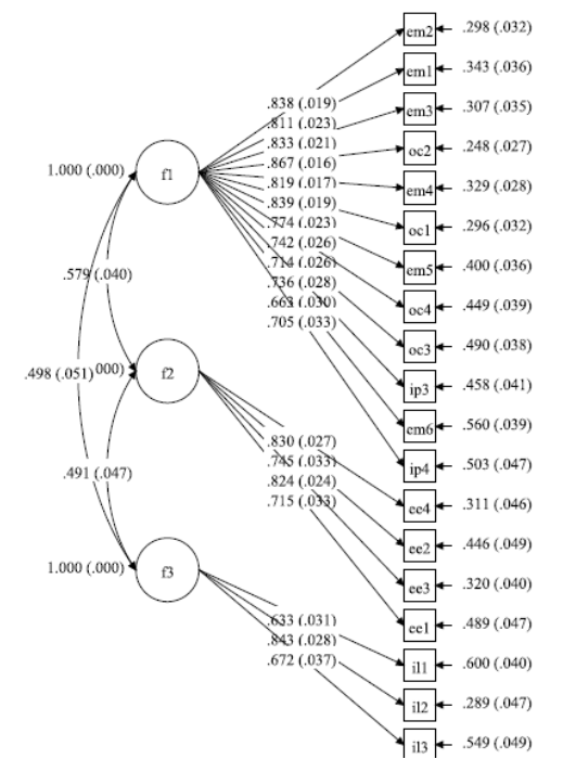 Con el propósito de mejorar el modelo, se siguió la estrategia de probar con la eliminación de los reactivos que presentan carga factorial baja, en este caso los reactivos IP1 e IL4, para encontrar una solución óptima al modelo propuesto. Así, se obtuvo un instrumento con 19 reactivos. Los resultados se presentan en la Tabla 5.