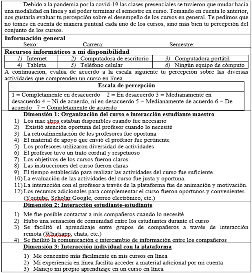 El instrumento fue construido y adaptado al contexto sociocultural de los estudiantes por profesores investigadores del departamento de Ciencias Económico Administrativas del TecNM, utilizando como base principal los instrumentos de evaluación de cursos en línea de Cidral, Oliveira, Di Felice y Aparicio (2018), Dziuban, Moskal, Kramer y Thomson (2012), Flores y López (2019), Robert, Irani, Telg y Lundy (2005), Palmer y Holt (2009) y Zambrano (2016).