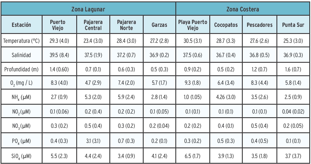 No se registraron diferencias significativas entre los parámetros ambientales de los sistemas costeros (ANOSIM, R = 0.09, P = 0.16). Respecto a la temperatura, el valor medio registrado (27.8 °C), muestra las condiciones tropicales de los cuerpos de agua estudiados con el valor máximo promedio de 30.5 °C, el cual se registró en Playa Puerto Viejo, y el mínimo (23.4 °C) en Pajarera Central. En forma similar, la salinidad presentó poca variación entre sitios con condiciones prácticamente marinas. Sin embargo, se registraron valores cercanos a 40 en las Lagunas Puerto Viejo y Pajarera Central y Playa Puerto Viejo (Tabla 1). En Pajarera Central también se registraron valores bajos de oxígeno disuelto (4.7 mg/L), altos de fosfatos (3.1 µM), amonio (5.3 µM). Respecto a los nitratos y nitritos, se determinaron valores mínimos en todos los sitios de estudio (Tabla 1). Tanto la Laguna como la Playa en Puerto Viejo, se caracterizaron por presentar valores máximos de silicatos y una alta asociación con la salinidad, mientras que Cocopatos y Pajarera Norte con los nitritos y fosfatos (Figura 4). Por el contrario, Pajarera Central y Garzas presentaron niveles bajos de oxígeno disuelto (Tabla 1). Por otra parte, Punta Sur no presentó ninguna relación con los nutrientes; se caracterizó por presentar aguas transparentes.