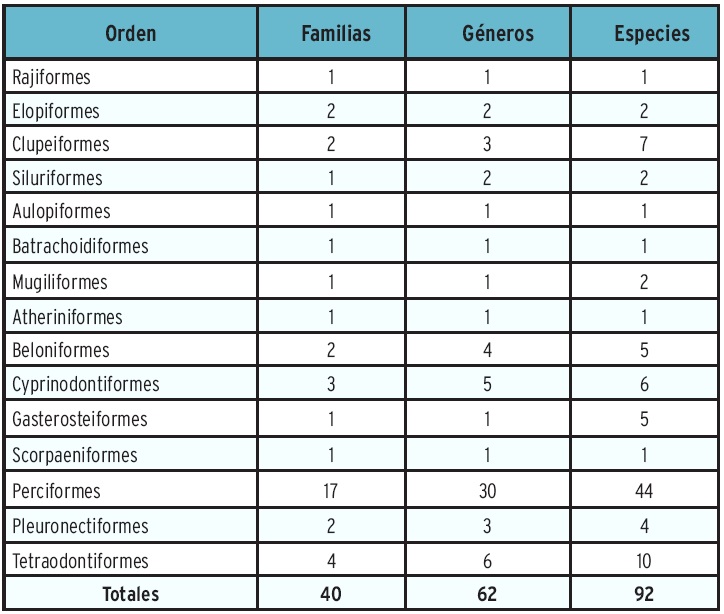De los 64 órdenes de peces propuestos para el mundo por Nelson (2006), en la Reserva de Isla Contoy se han registrado 15 (23 %), los cuales agrupan a 40 familias, que corresponden al 7.2 % del total a nivel mundial en base a Eschmeyer (2014), y a un registro de 62 géneros y 92 especies (Tabla 2). Estos datos hablan por sí mismos de la alta diversidad íctica de la Reserva, que se refleja en los registros de especies de los componentes eurihalino, estenohalino, estuarino y dulceacuícola (Tabla 3). Dentro de los órdenes registrados, el de los Perciformes fue el que alcanzó el mayor número de familias (17). Las familias más representativas por comprender el mayor número de especies pertenecen a este orden: Scaridae con 10 especies incluidas en cuatro géneros y Gerreidae con un total de seis especies; y al orden Gasterosteiformes: Syngnathidae con cinco especies. El patrón observado de ocurrencia de especies de las Familias Cichlidae y Poeciliidae, sugiere la presencia de descargas puntuales de agua dulce (afloramientos), en la zona lagunar y costera de isla. Cabe resaltar que estas especies son de un origen dulceacuícola secundario, es decir que han evolucionado en el agua dulce, pero se han originado de grupos marinos y son capaces de cruzar pequeñas regiones marinas (Lowe-McConnell, 1987; Vega-Cendejas y col., 2013).