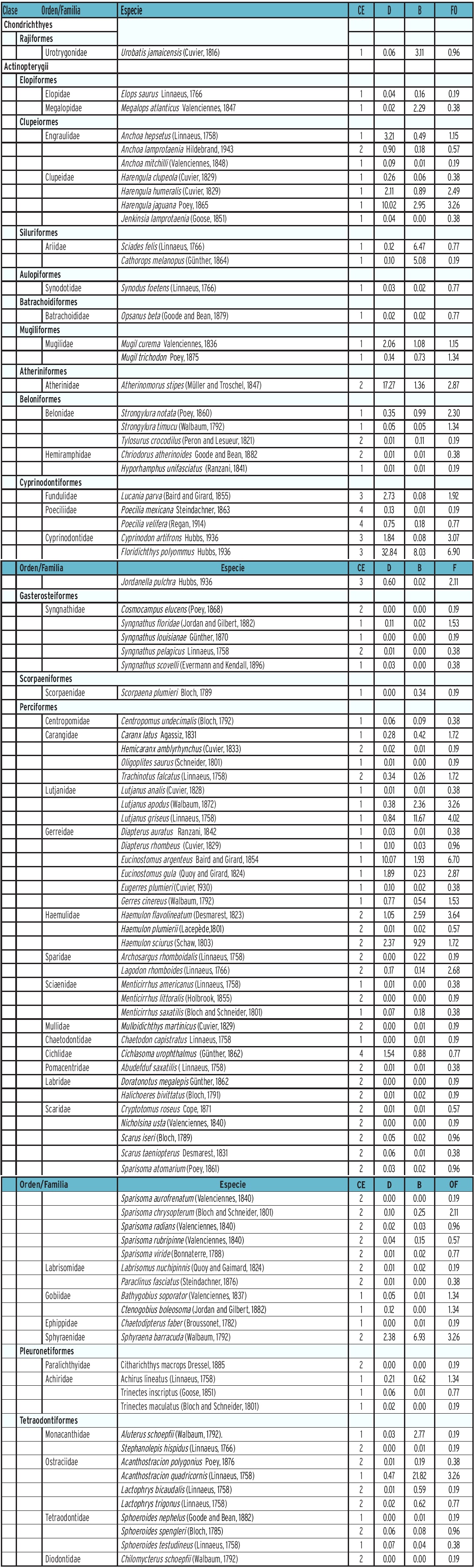 Los ejemplares recolectados, después de haber sido sometidos a un proceso de lavado, se identificaron utilizando bibliografía especializada (Fisher, 1978; Dickson y Moore, 1998; McEachran y Fechhelm, 2005). El orden sistemático se basó en el criterio de Greenwood y col. (1967), modificado por Nelson (2006). Se registró individualmente el peso y la longitud estándar (LE) de cada espécimen a fin de elaborar las bases de datos correspondientes. Los peces se dividieron en cuatro categorías ecológicas de acuerdo a su origen y tolerancia a la salinidad como eurihalino, estenohalino, estuarino y especies de agua dulces (Day y col., 1989; Castro-Aguirre y col., 1999).