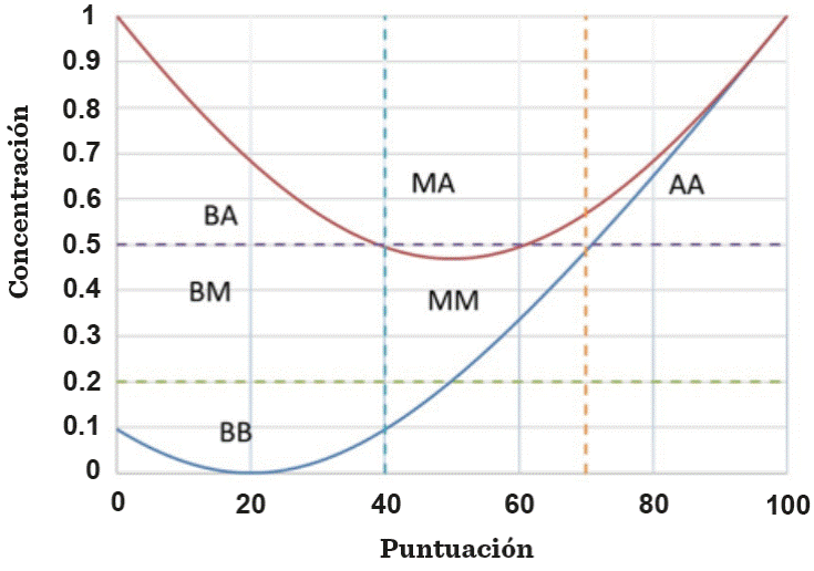 La distribución de las respuestas, están limitadas por las curvas P-C de la gráfica, en la que la variable dependiente es la concentración. En la Figura 1 se puede apreciar cómo se distribuyen las regiones, correspondientes a las combinaciones que se dan entre los aciertos y la concentración (bajo-bajo; alto-alto, medio-alto, por ejemplo). La organización y el análisis de los datos se obtuvo con la ayuda de software Excel. Cabe recordar que la concurrencia de uno o más puntos en la zona BB (bajo-bajo) indica aleatoriedad en las respuestas correspondientes al ítem en cuestión (Tabla 5). Es preciso aclarar que lo anterior no se refiere a la dispersión de los puntos, sino a la zona en la que están los puntos. En la Figura 1, para el puntaje de aciertos en la prueba, se usa una escala centesimal, cuyo equivalente decimal sería, por ejemplo, 0.1 = 10; .4 = 40; 1.0 = 100. Ello debido a que dicha escala es necesaria para que el software presente completamente los límites. En la Figura 2 se mantiene esta equivalencia y ya no es necesario usar la escala centesimal.