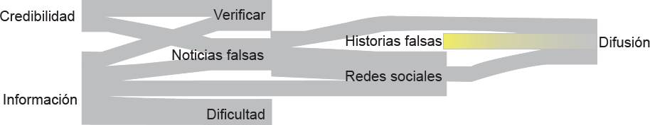 Figura 2 El diagrama de Sankey muestra el flujo de interacciones de los procesos de la posverdad según las redes semánticas extraídas de las publicaciones.