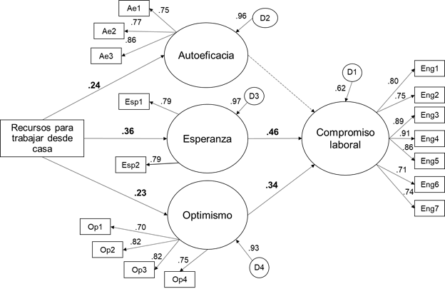 Sin embargo, el modelo presentó múltiples problemas de ajuste (χ2 (221) = 828.67, p < .05; χ2/df = 3.74; RMSEA = .083; CFI = .89; NNFI = .88) e incluso el programa no fue capaz de calcular los residuales indicando problemas de dependencia, por ello se simplificó el modelo, declarándose directamente al compromiso laboral como factor de primer orden. Durante el proceso se retiraron algunos reactivos, que incluyeron a los tres del factor resiliencia, al ser no significativos. Por otra parte, se apreció que el indicador de recursos para trabajar desde casa no presentaba un efecto significativo con el compromiso laboral, pero sí se relacionaban con los factores de CapPsi, así que se propuso una modificación a la propuesta inicial de forma que los factores de CapPsi pasaron a tener un papel mediador entre los recursos para trabajar desde casa y el compromiso laboral.