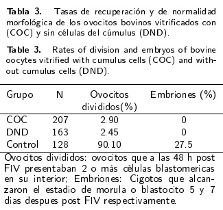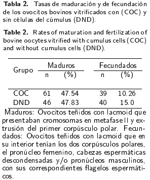 Bajo las condiciones del presente estudio, se observó que la vitrificación de ovocitos sin las células del cúmulus, disminuyó su calidad morfológica postdescongelación. La tasa de maduración fue similar entre los ovocitos vitrificados con y sin células del cúmulus. Las tasas de fecundación y de división fueron bajas en ambos grupos (COC y DND) y no se encontró desarrollo embrionario.