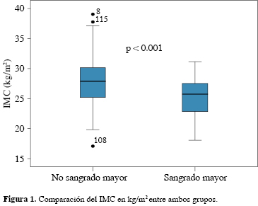 El grupo con sangrado mayor (casos) presentó un peso medio de 67.99 kg y desviación estándar (DE) de 12.70 kg, mientras que para el grupo sin sangrado mayor el peso medio fue de 76.08 kg y DE de 12.95 kg; en cuanto al IMC la media fue de 25.25 kg/m2 y la DE de 3.17 kg/m2 en el grupo con sangrado mayor y una media de 28.10 kg/m2 (DE = 4.02 kg/m2) en los que no presentaron sangrado mayor. Conforme a lo anterior se encontraron con sobrepeso 26 pacientes en el grupo con sangrado mayor y 75 pacientes en el grupo sin sangrado mayor (Figura 1).