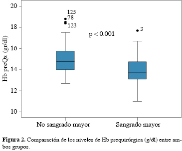 Los pacientes con sangrado mayor presentaron una mediana de Hb prequirúrgica de 13.7 g/dl (11-17.7) y los del grupo control presentaron una mediana de 14.8 g/dl (12.7-18.8) (Figura 2); la Hb postquirúrgica del grupo de casos tuvo una media de 10.34 g/dl (DE = 1.54) y el grupo control una media de 10.9 g/dl (DE = 1.53).