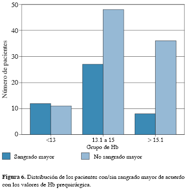 El valor prequirúrgico de Hb demostró ser un factor importante en la presencia de sangrado mayor al dividir a los pacientes en tres grupos de acuerdo con su valor de Hb previo a la cirugía, resultando que pacientes con riesgo más alto de sangrado mayor presentaban una Hb > 13 g/dl (Figura 6).