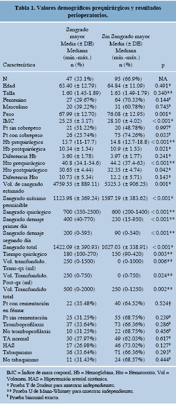 ABSTRACT. Total hip arthroplasty is a common procedure whose typical duration is greater than 90 minutes and is associated with substantial blood loss. It is usually performed in patients > 60 years who have comorbidities. Knowing the factors associated with major bleeding in patients undergoing this procedure will allow us to identify patients who are at risk. Material and methods: We performed a retrospective study, according to a case-control model selecting patients for the primary outcome: major bleeding/not major bleeding. We included 142 patients treated with total hip arthroplasty, divided into 47 cases and 95 matched controls. Results: The variables that showed a higher association to influence the presence of major bleeding was preoperative hemoglobin and hematocrit, BMI, operating time, as well as the use of blood transfusion increased the time of hospital stay. The preoperative hemoglobin value showed that the type of patient more associated with major bleeding had a hemoglobin > 13 g/dl. We observed that 102 patients (71.8%) who underwent a blood transfusion had an increased length of stay (p 0.007). Conclusion: The presence of major bleeding is a frequent event. When knowing the factors associated with major bleeding, the surgical team can anticipate this event and modify it as possible.