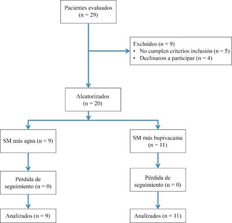 Ensayo clínico controlado, doble ciego con características específicas de población, prospectivo, reproducible, comparativo, longitudinal, con número de registro NCT02514343 en clinicaltrials.gov; se propuso estudiar 20 pacientes, dividiéndolos aleatoriamente en dos grupos (Figura 1). Los criterios de inclusión fueron: edad mayor a 18 años, fractura de radio distal tratada con colocación de clavos percutáneos, inmovilización por seis semanas, firma del consentimiento informado. Criterios de exclusión: alergias a los medicamentos utilizados en el estudio, antecedente de consumo o abuso de drogas, antecedentes de enfermedad siquiátrica, deficiencia cognitiva, enfermedad pancreática, cardíaca, pulmonar, hepática o renal, infecciones, presión arterial baja. Nuestro estudio fue aprobado por el Comité de Ética en Investigación de nuestra institución, con número de registro OR15-009.