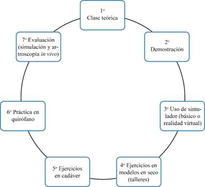 El plan de entrenamiento en artroscopía para residentes será progresivo en dificultad teórica y práctica durante los cuatro años de residencia. Como métodos didácticos auxiliares se utilizarán simuladores de caja, de realidad virtual de retroalimentación háptica, modelos en seco y cadavéricos.
