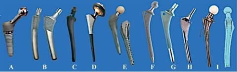Figura 7: Diversos tipos de vástagos no cementados: A) roscado; B) curvo (PCA/Howmedica); C) anatómico, (Bichat III BG Benoist Girard & Cir); D) Recto (FL Multineck/Lima-alto); E) Hecho a la medida transquirúrgico (Evolution/FEHLING Medical AG); F) Con recubrimiento largo, (Solution/DEPuy); G) Recubrimiento intermedio (AML/DePuy); H) Con recubrimiento corto (MultiLock/Zimmer); I) Diseño híbrido (Das «Rippen-system»/Waldemar Link).