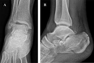 Figura 1: A) Radiografía frente de tobillo: alteración del tilt astragalino normal. B) Radiografía perfil de tobillo: alteración de ángulos de Bohler (-8°) y Gissane (116°).