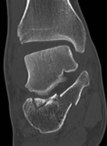 Paciente masculino de 39 años de edad, sin antecedentes de relevancia, sufre traumatismo de moderada energía en miembro inferior derecho. Relató entorsis de tobillo asociado a trauma directo en talón. Presentaba dolor, edema, hematoma e impotencia funcional. El examen físico reveló inestabilidad ante la maniobra de flexión plantar e inversión. Las radiografías evidenciaron fractura de calcáneo desplazada, con marcada alteración de los ángulos de Bohler (-8o) y Gissane (116o) (Figura 1). La tomografía evidenció compromiso de la articulación subastragalina y alteración de la articulación tibioperoneo astragalino 3AC según la clasificación de Sanders6 (Figura 2). Se realizó inmovilización con bota corta de yeso.