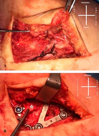 Figura 3: A) Abordaje lateral. Fractura de calcáneo y lesiones de partes blandas asociadas. B) * indica la lesión del ligamento peroneo calcáneo.
