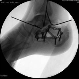 Se decidió realizar primero la reducción del calcáneo mediante clavijas y posteriormente osteosíntesis con placa para calcáneo SCP bloqueada de 3.5 mm (South American Implants, Argentina). Se constató adecuada reducción mediante el intensificador de imágenes (Figura 4). Aprovechando el mismo abordaje, se exploraron los ligamentos LPAA y LPC. Ambos presentaban signos de ruptura aguda, cercanos a su inserción proximal. Se realizó la reconstrucción ligamentaria utilizando anclajes con suturas transóseas al peroné distal. Se constató una adecuada estabilidad ante maniobras de estrés.
