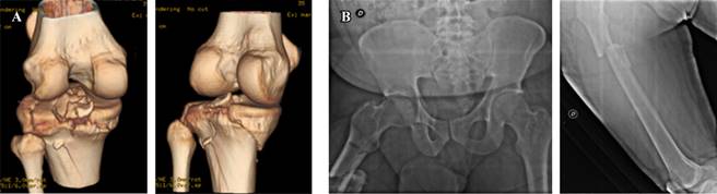 Figura 1: Rayos X iniciales. A) Fractura de platillos tibiales izquierdos y B) fractura subtrocantérica derecha.