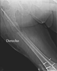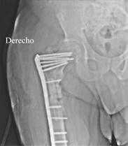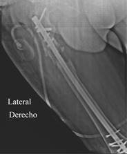 Entre 2016 y 2019 tuvo episodios esporádicos de dolor en cadera derecha que cedían fácilmente al manejo con antiinflamatorios y analgésicos sin limitar las actividades de la vida diaria y en la toma de rayos X se observaba fatiga de los bloqueos distales con dudas de la consolidación de la fractura (Figura 3).