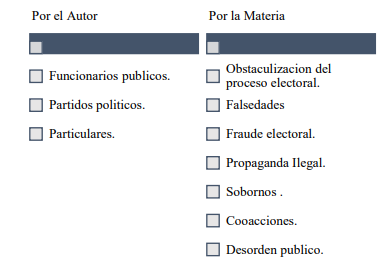 Por otra parte, los Delitos Electorales se pueden agrupar o clasificar según la materia, en este sentido Fernández Segado & Martínez Porcayo (2017) nos expresan que según la materia los delitos pueden ser; de obstaculización al proceso electoral, falsedades, fraude electoral, propaganda ilegal, soborno, coacciones y desorden público.